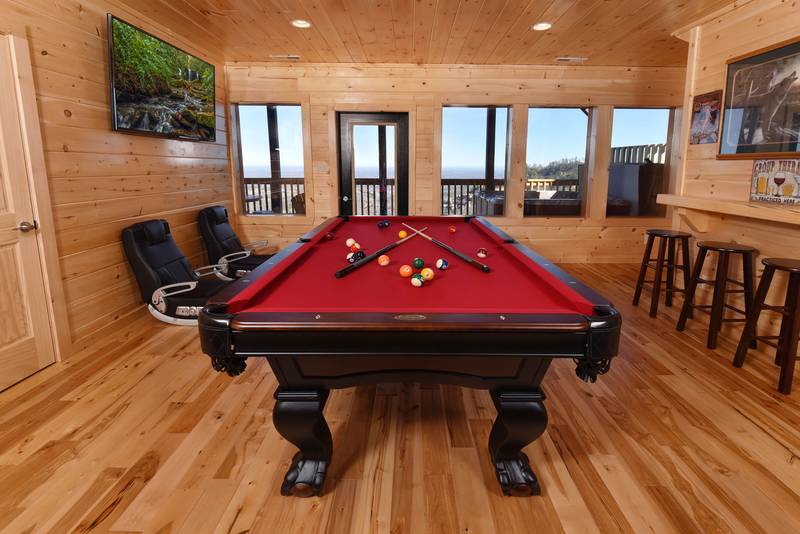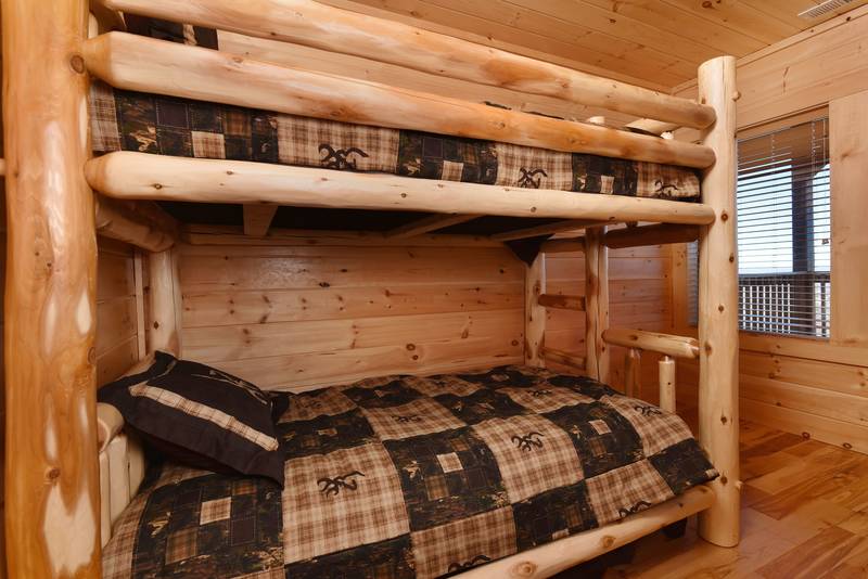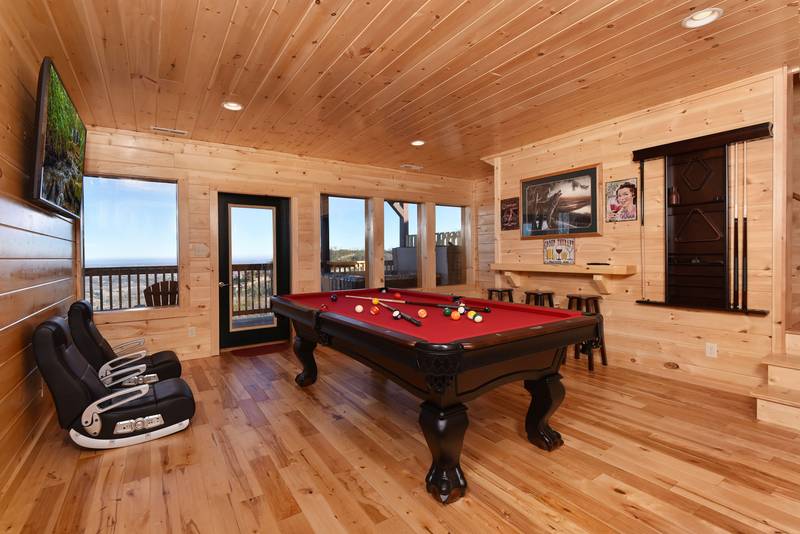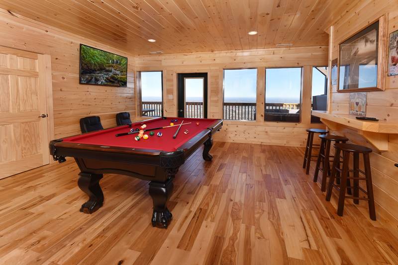 The lower level features a game room with a 55-inch Flat Screen Television, Pool Table, and Bar Top. Don’t miss the game, or the movie while enjoying the luxury of the game room overlooking the mountain views. There are 3 bedrooms located in the lower level. There is a Queen Size Bed, Flat Screen Television, and a bathroom featuring a Walk In Shower. The additional bedroom has a Bunk Bed and Flat screen television. The lower level deck area offers the hot tub. The hot tub is located on the lower level deck. Everlasting View has vast mountain views from each level of the cabin. This is the perfect getaway in a log cabin with views as far as the eye can see. This cabin even features wireless Internet Access. No Pets Please, No Smoking Please, Sleeps 12.