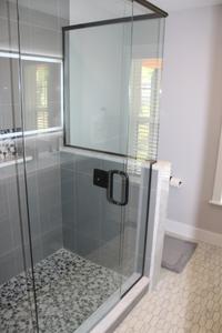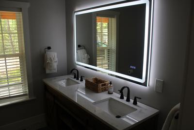 Both bathrooms are designed with a modern touch, featuring heated, illuminated mirrors for a spa-like experience. One bathroom includes a sleek walk-in shower, while the other offers a convenient tub/shower combination.