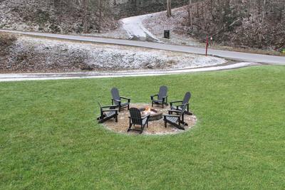 - Large front yard with fire pit